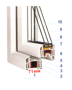 ТеплоБольшая ширина профиля "ФАВОРИТ" — 71 мм (1) — позволяет установить широкий стеклопакет (9), что способ-ствует сохранению в доме тепла. Помимо этого важную роль в обеспечении теплоизоляции играют 5 воздушных камер профиля (3). |